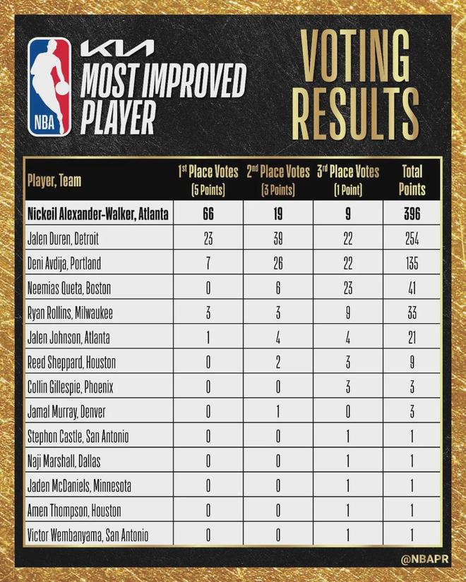 本賽季這個獎項競爭很激烈,開拓者的阿夫迪亞以及活塞的杰倫-杜倫都是熱門人選。教主在文章中多次提到,沃克配得上進步最快球員獎。沃克獲得了66張第一選票,總得分396分。杜倫拿到23張第一選票,總得分254排名第二。
