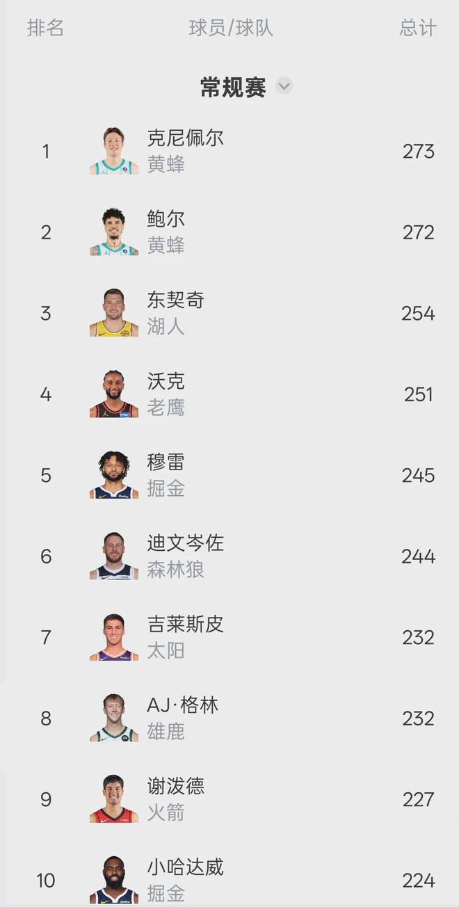 阿夫迪亞僅拿到7張第一選票,總得分135分排名第三。再往后是凱爾特人的奎塔,雄鹿的羅林斯、火箭的謝潑德、太陽的吉萊斯皮和掘金的穆雷。文班亞馬、阿門-湯普森、卡斯爾等人各拿到1張第三選票,總得分1分并列第10。